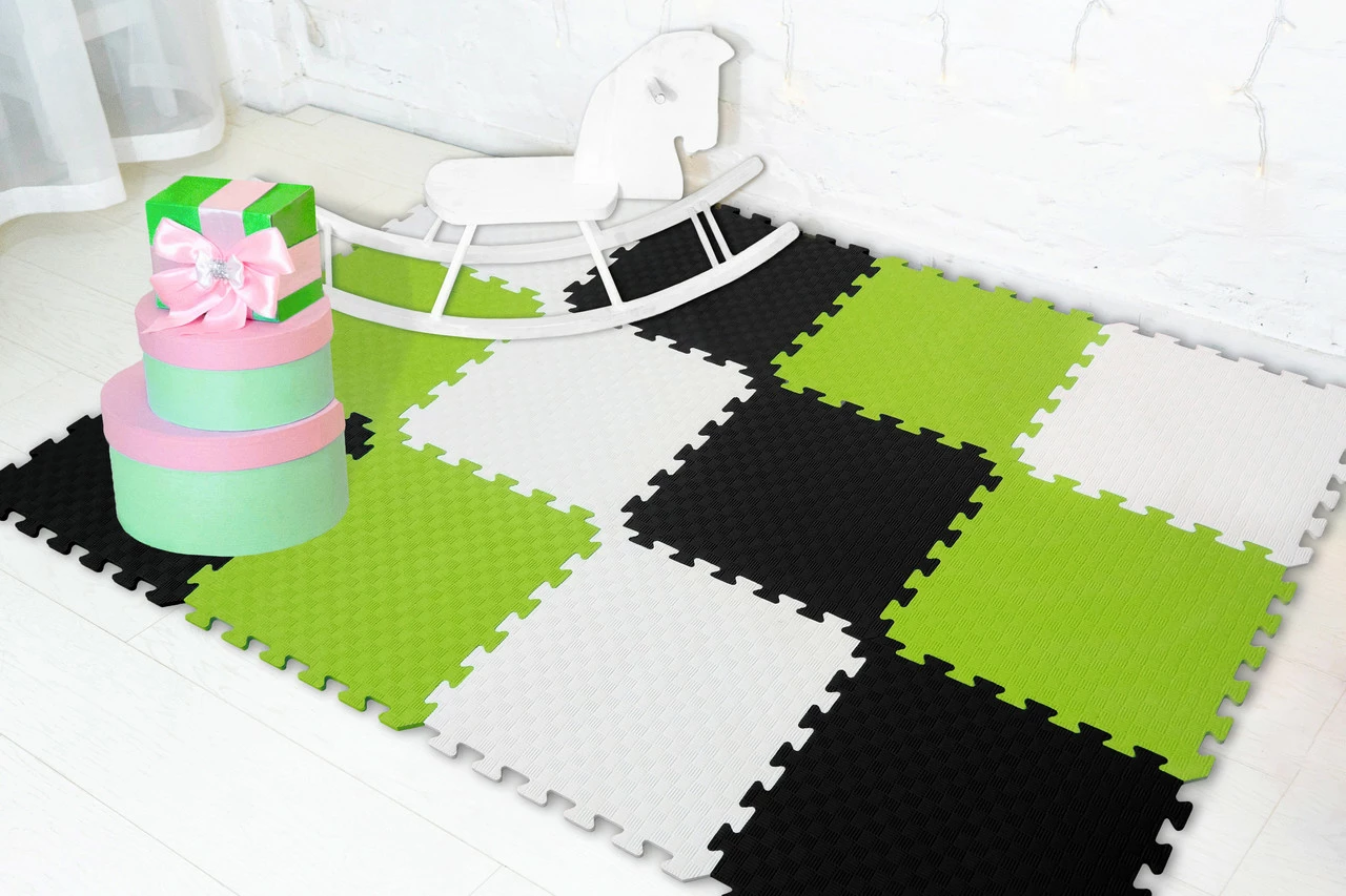 Мягкий пол коврик-пазл "Радуга" Eva-Line 200*150*1 см Черный/Белый/Лаймовый – экологически чистое напольное покрытие для детских комнат, игровых зон, спортивных залов, гостиной, спальни, балконов.
