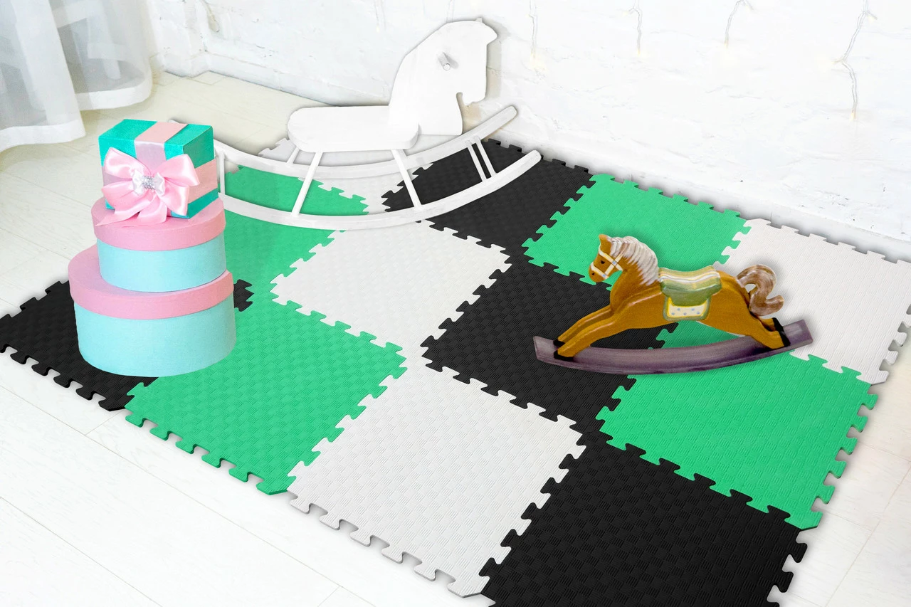 Мягкий пол коврик-пазл "Радуга" Eva-Line 200*150*1 см Черный/Белый/Зеленый – экологически чистое напольное покрытие для детских комнат, игровых зон, спортивных залов, гостиной, спальни, балконов.