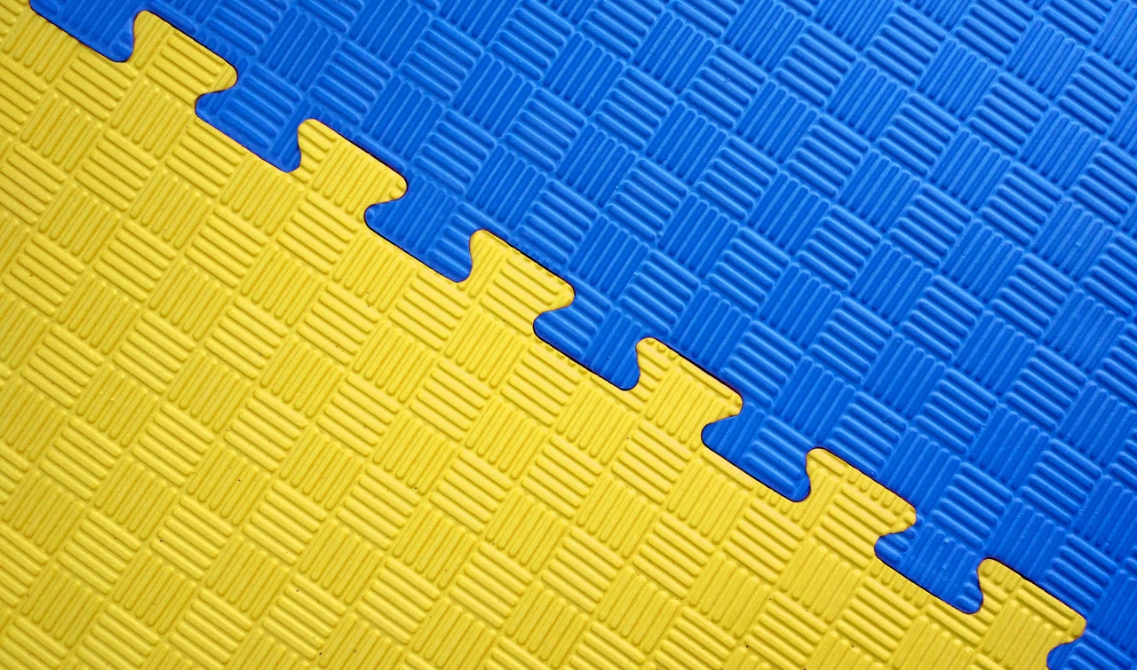 Двухсторонний двухцветный мат (желтый/синий) из вспененного ЭВА-полимера.